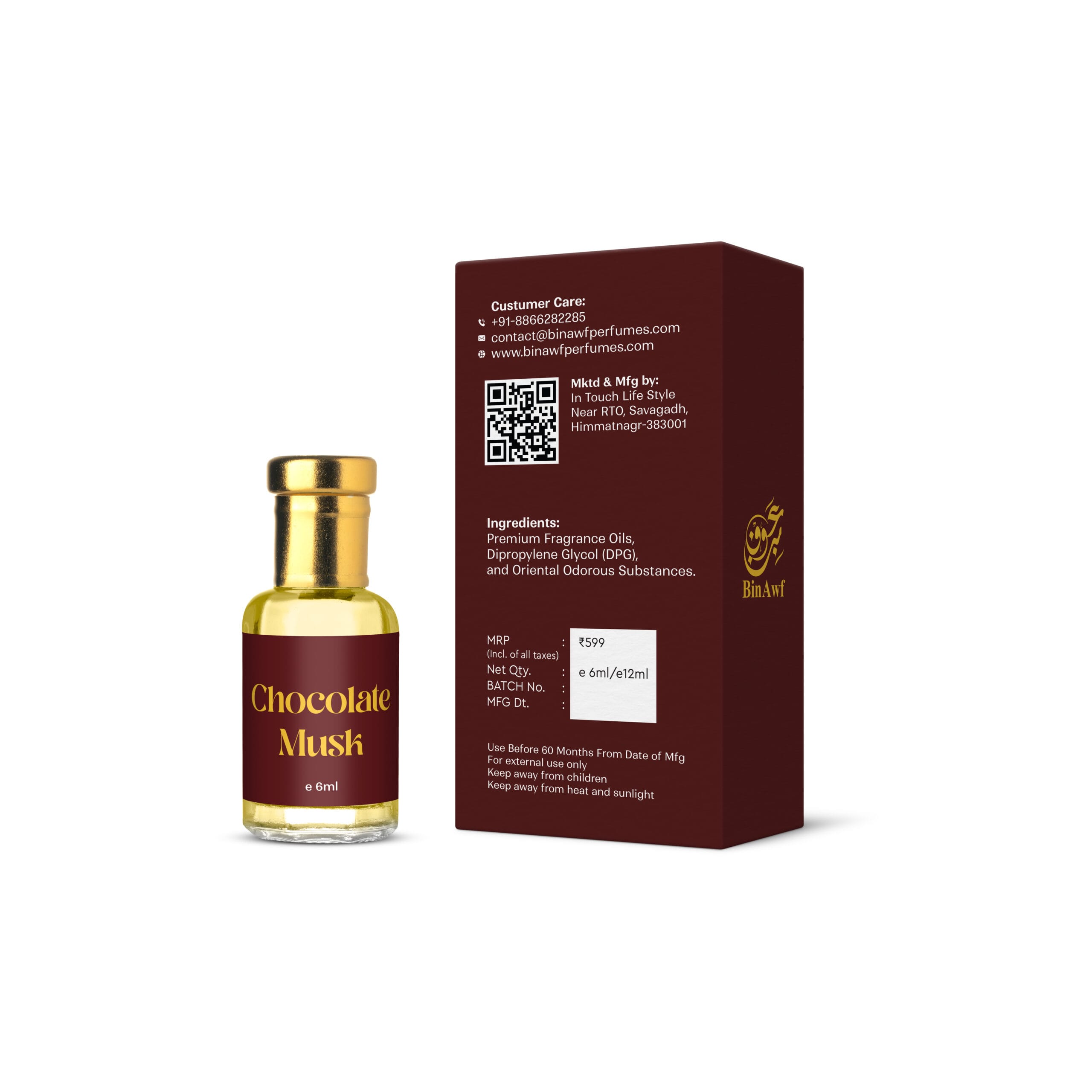- BinAwf Chocolate Musk Attar opens with delectable top notes of rich Cocoa and indulgent Chocolate, leading into a smooth heart of Caramel and warm Musk. The fragrance settles into a sweet and comforting base of Orange Flavor and Vanilla, creating a delightful and irresistible scent.