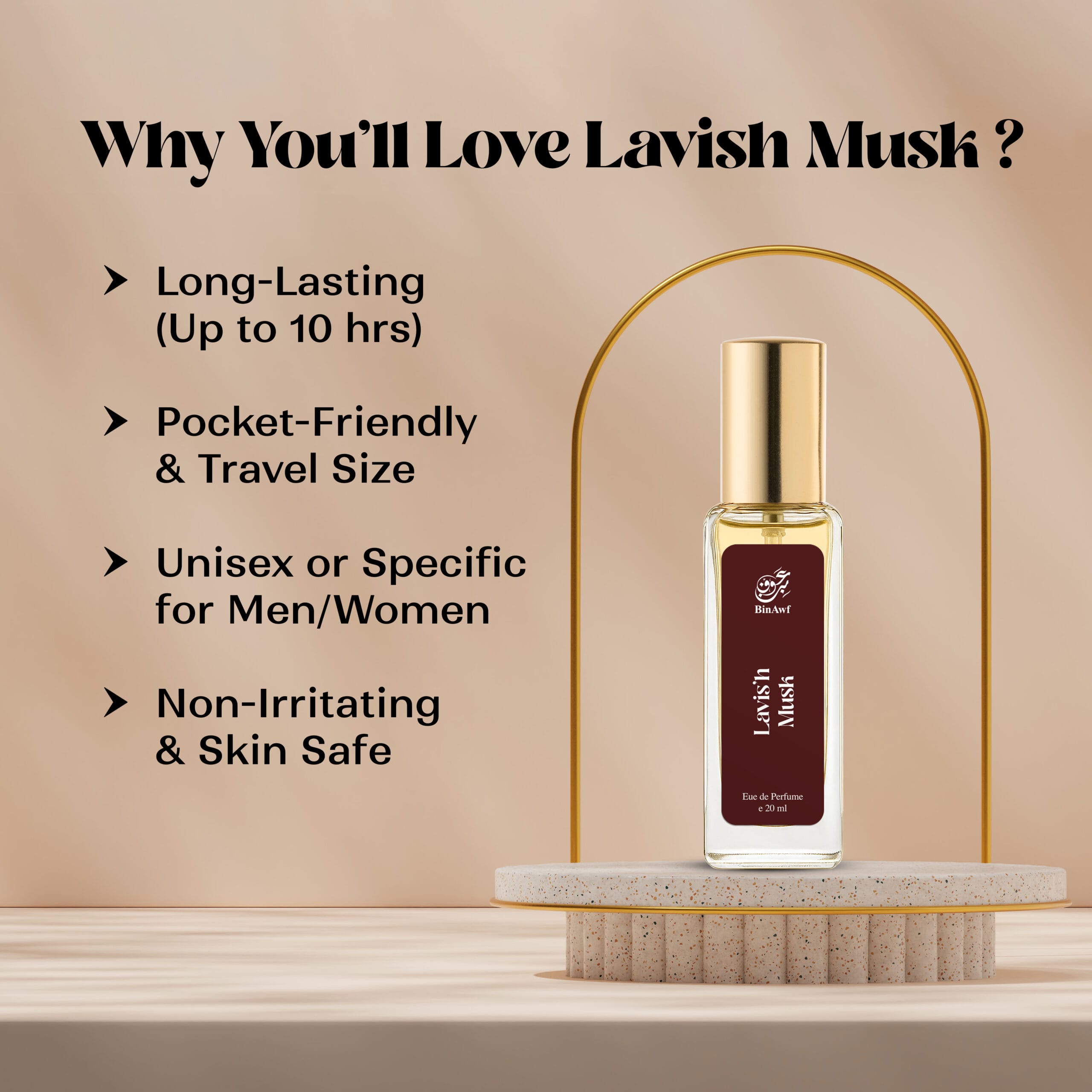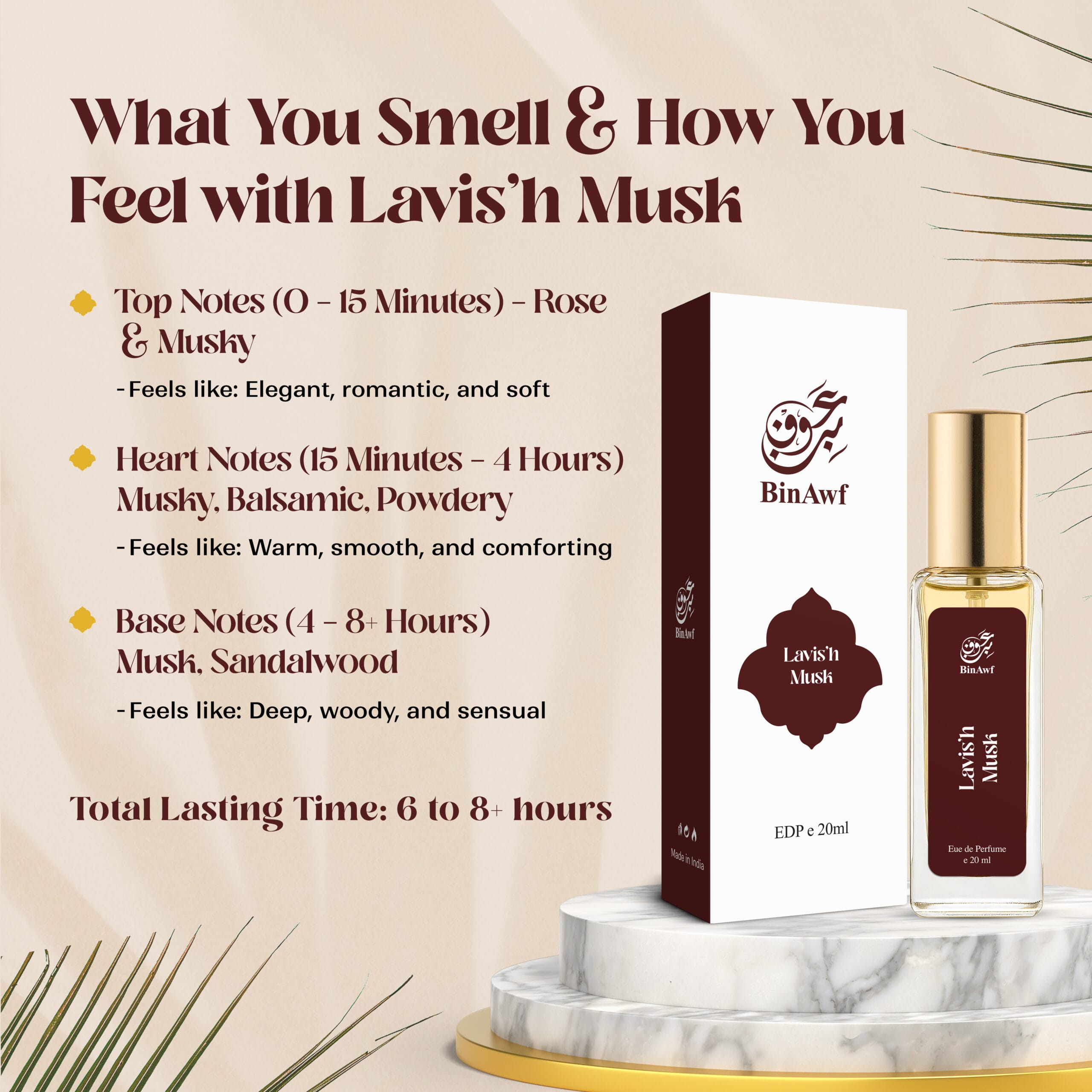 - BinAwf Lavish Musk opens with a blend of rose and musky top notes, transitions into musky balsamic powder as the middle note, and settles into a base of musk and sandalwood.