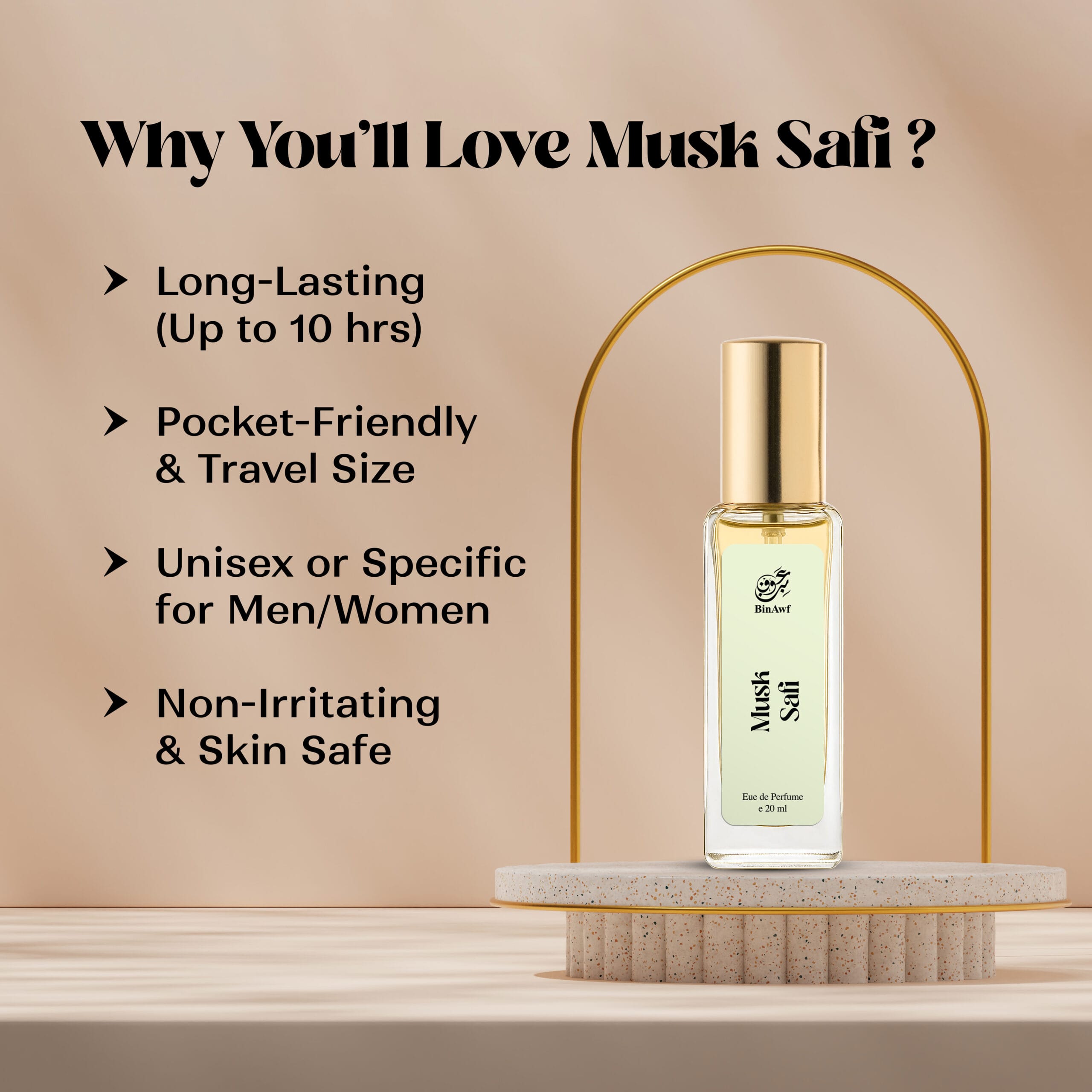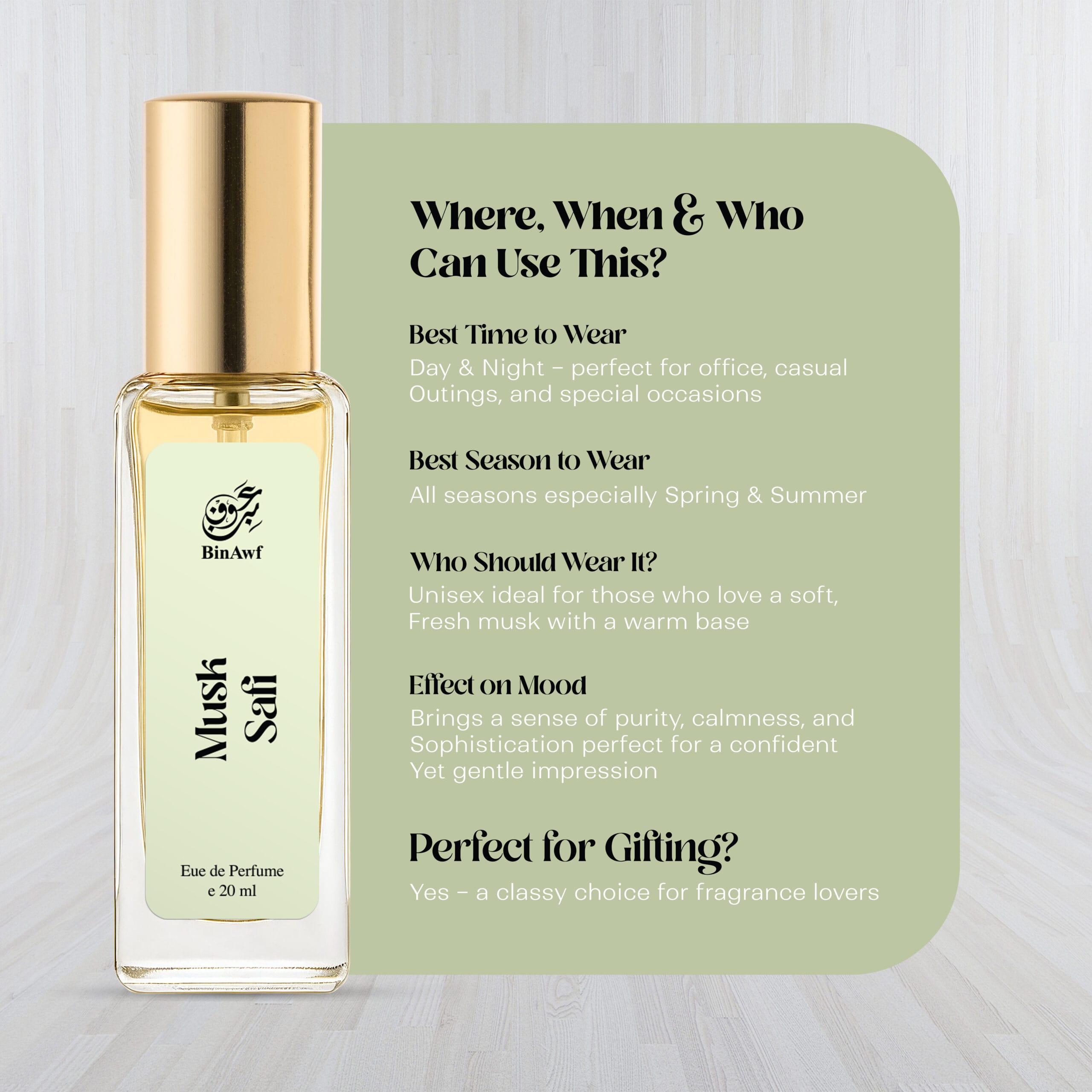 - BinAwf Musk Safi is perfect for any occasion, ideal for those who prefer a natural scent with a very light tone.