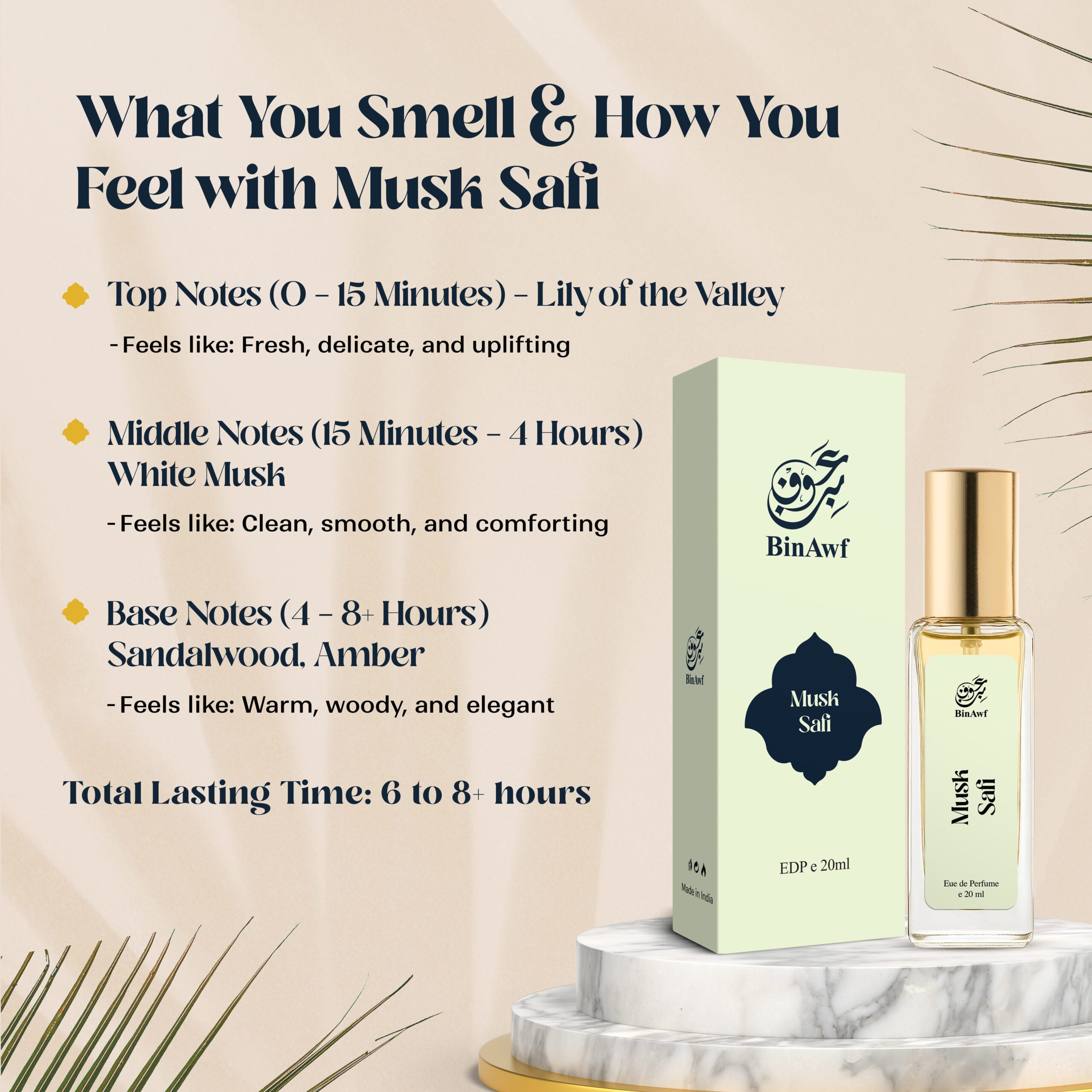 - BinAwf Musk Safi features lily of the valley as the top note, white musk as the middle note, and a base of sandalwood and amber.