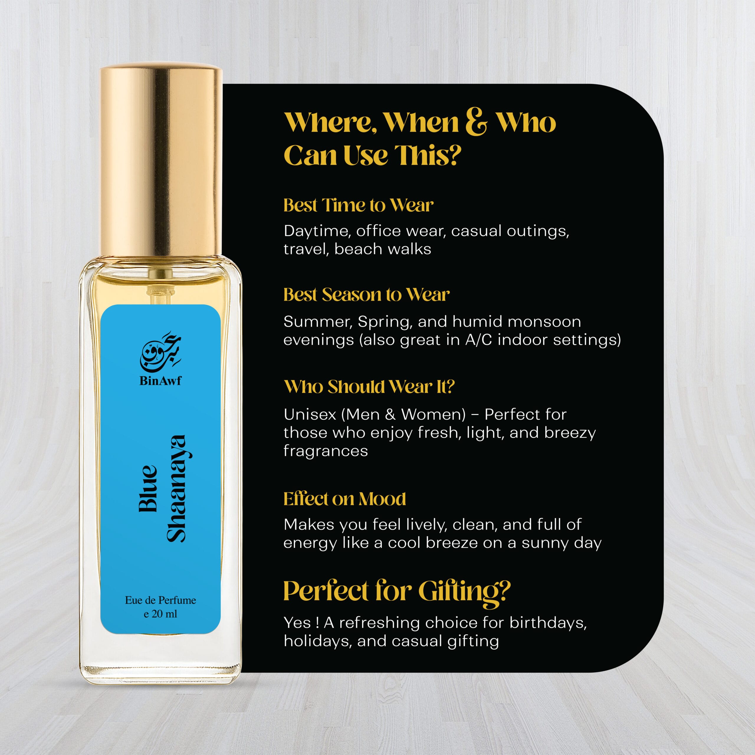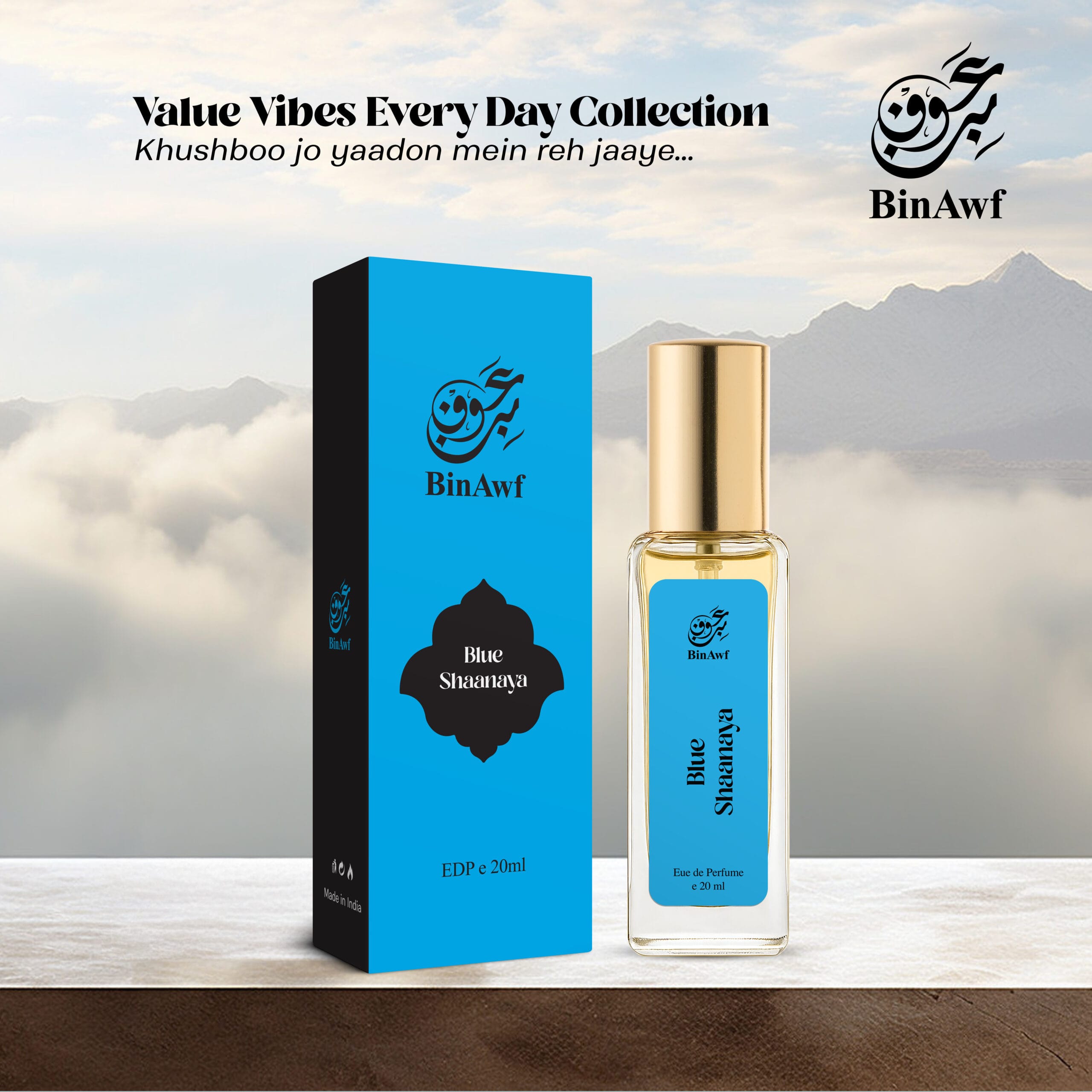 - BinAwf Shanaya Blue resembles a fresh, powdery scent, perfect for hot summers with its sea-like freshness. Ideal for the gym, office, and warm climates, it provides a revitalizing and cool vibe.